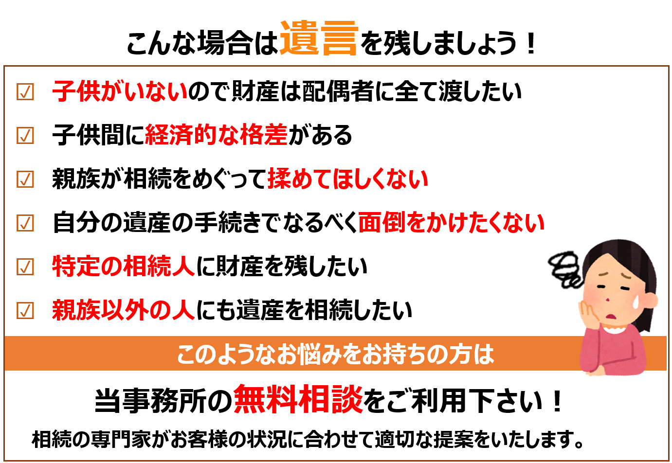 うちの家族は仲が良いから大丈夫、と安心されているご家族であっても、残されたご家族のために、そしてご本人の思いを伝えるために、遺言をかかれることをお勧めします。