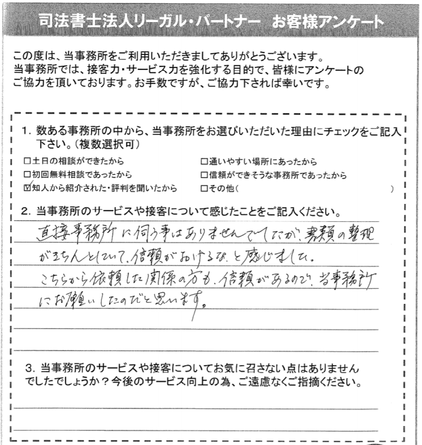 こちらから依頼した関係の方も信頼があるので、当事務所にお願いしたのだと思います。