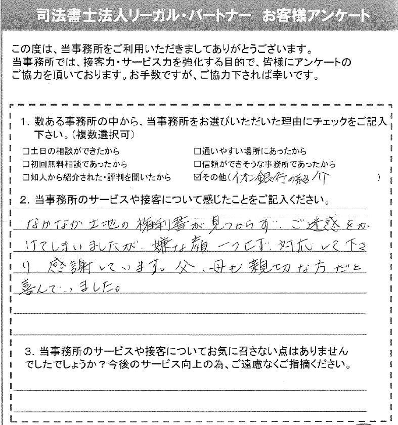 なかなか土地の権利書が見つからず、ご迷惑をかけてしまいましたが、嫌な顔一つせず対応して下さり、感謝しています。父、母も親切な方だと喜んでいました。