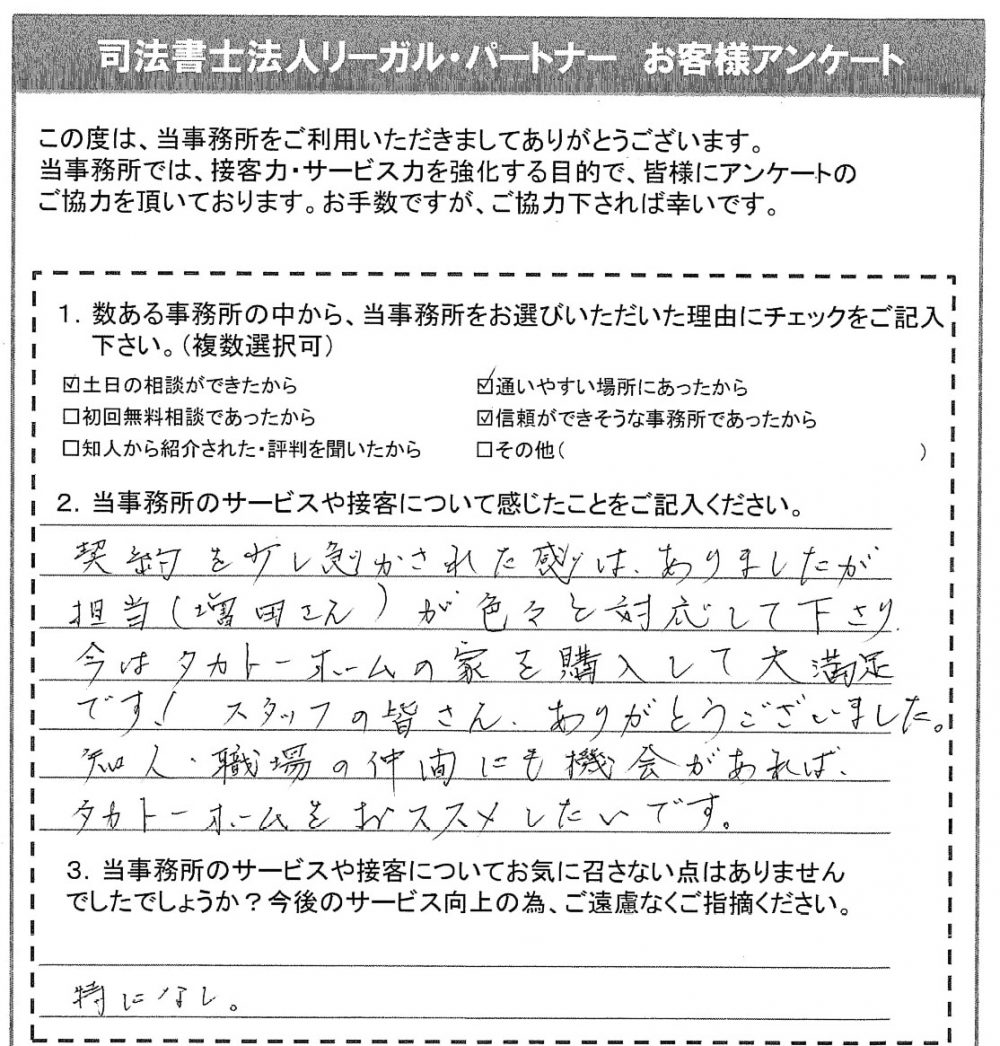 スタッフの皆さん、ありがとうございました。知人・職場の仲間にも機会があれば、タカトーホームをオススメしたいです。
