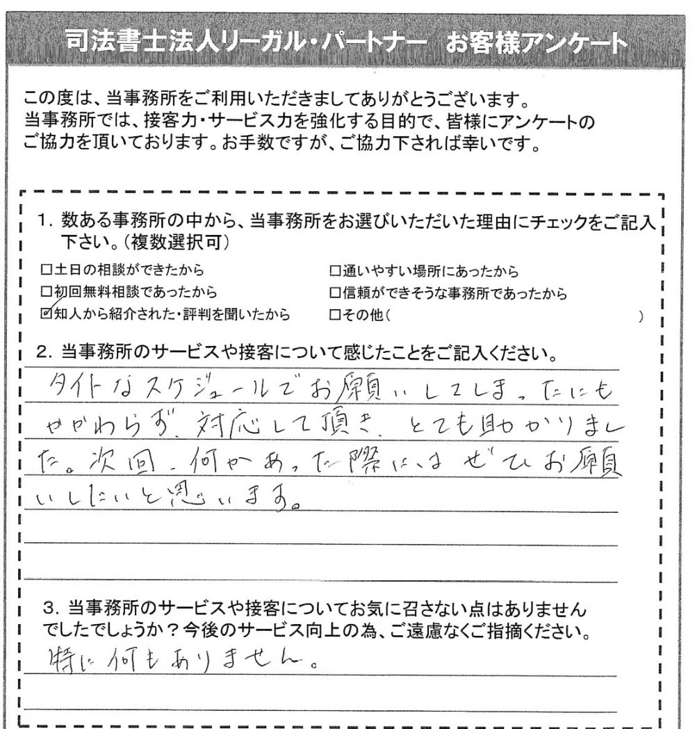タイトなスケジュールでお願いしてしまったにもかかわらず、対応して頂き、とても助かりました