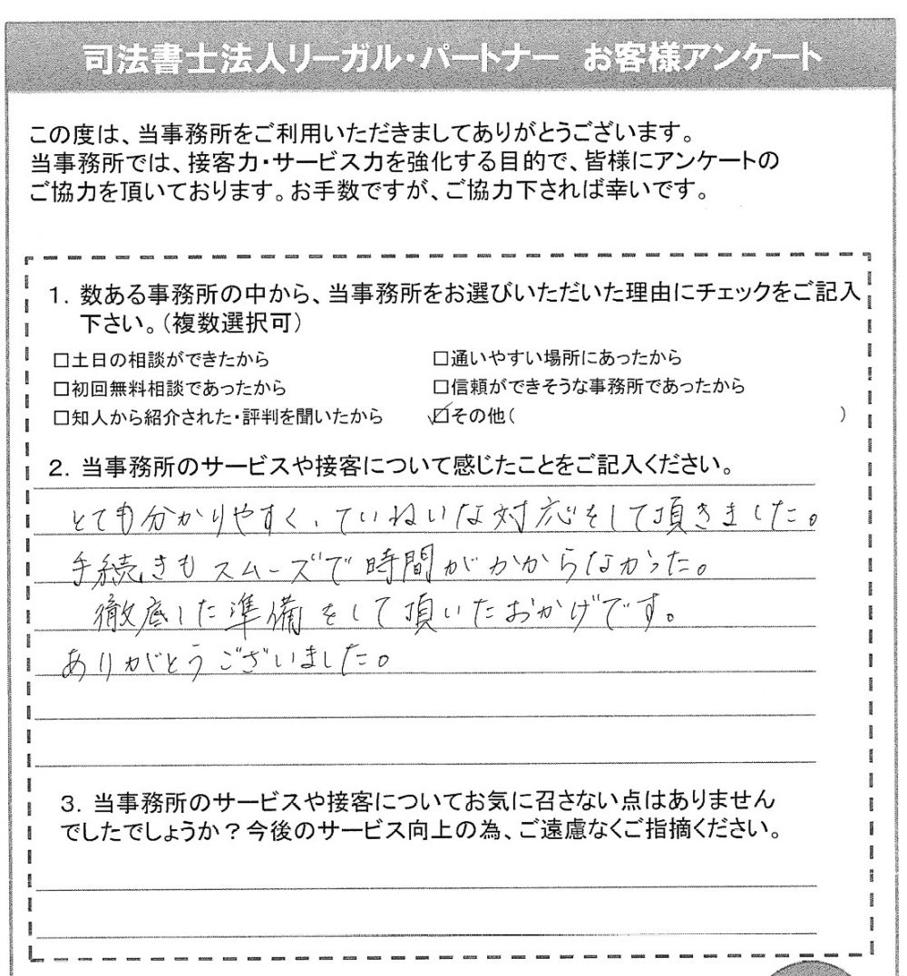 とても分かりやすく、ていねいな対応をしていただきました。手続きもスムーズで時間がかからなかった。