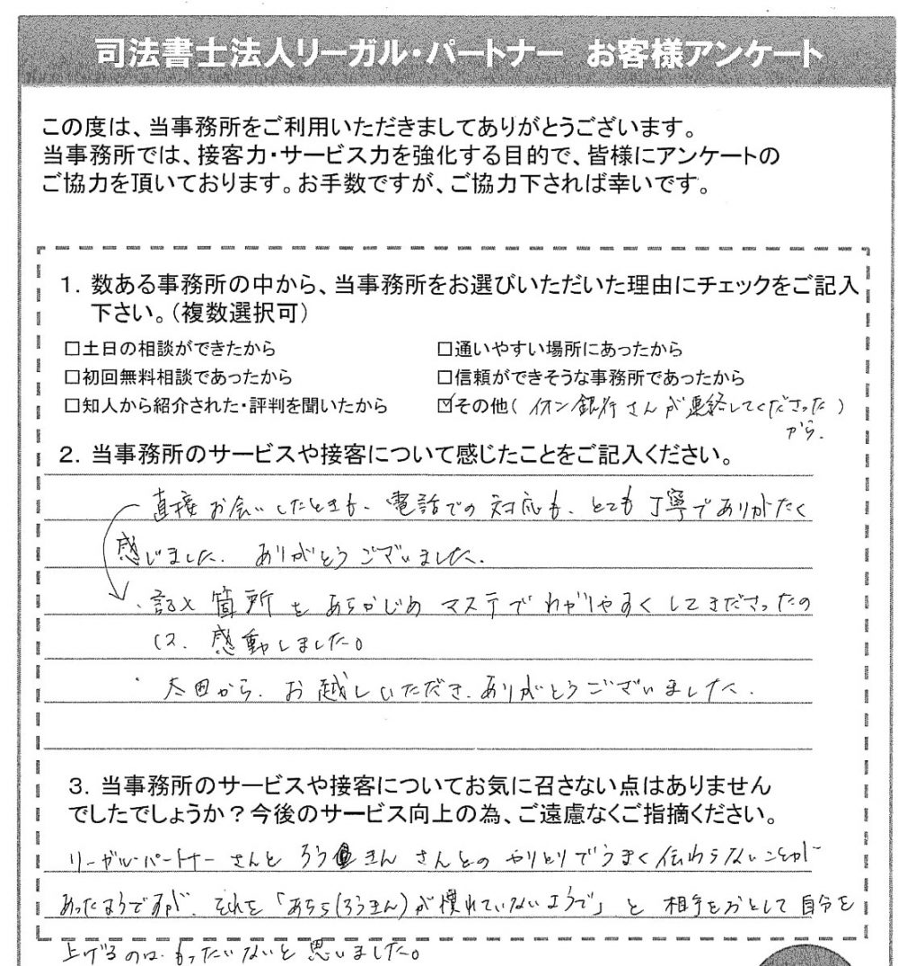 直接お会いした時も、電話での対応も、とても丁寧でありがたく感じました。ありがとうございました。また、記入箇所をあらかじめマステでわかりやすくしてくださったのには感動しました。太田からお越しいただき、ありがとうございました。