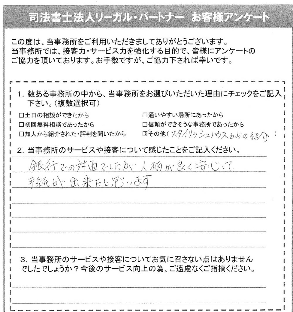 銀行での対面でしたが、人柄が良く安心して手続ができたと思います。
