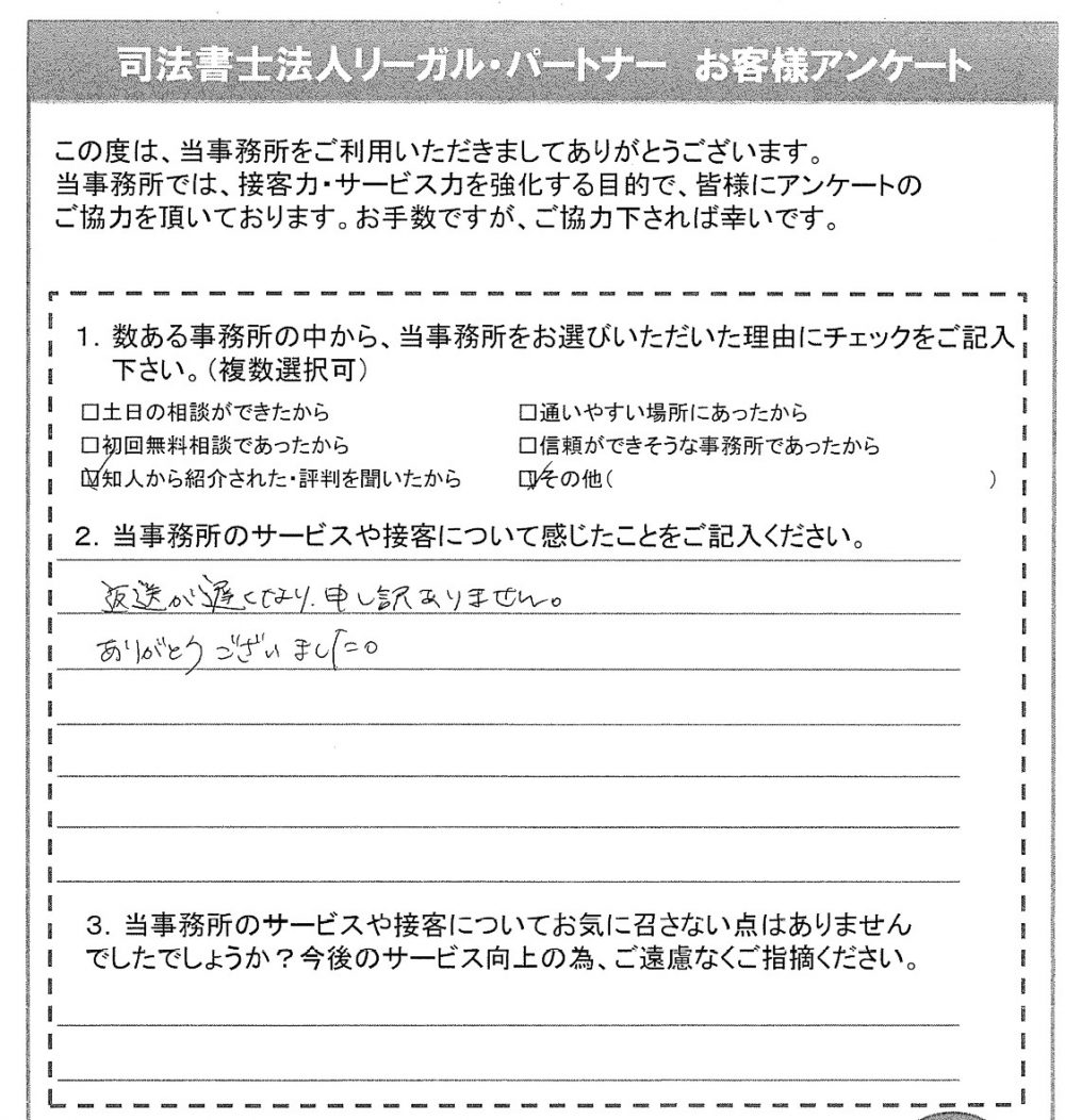 返送が遅くなり、申し訳ありません。ありがとうございました。