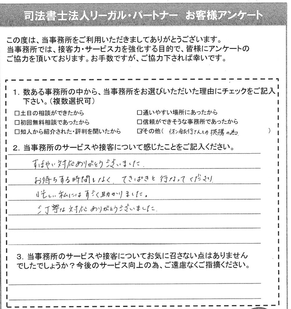 すばやい対応ありがとうございました。お待ちする時間もなく、てきぱきと行ってくださり、忙しい私にはすごく助かりました。ご丁寧な対応ありがとうございました。