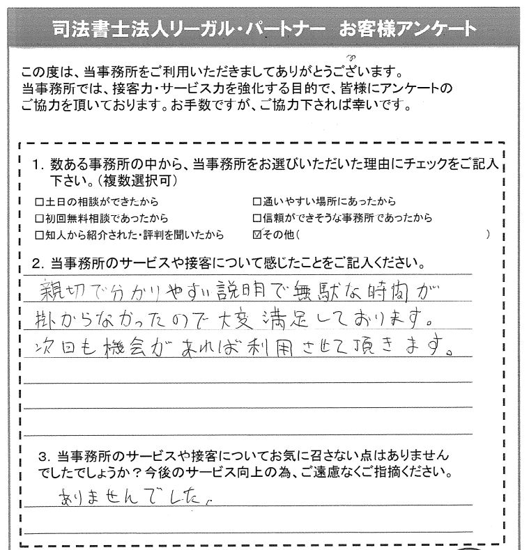 親切で分かりやすい説明で無駄な時間が掛からないかったので大変満足しております。