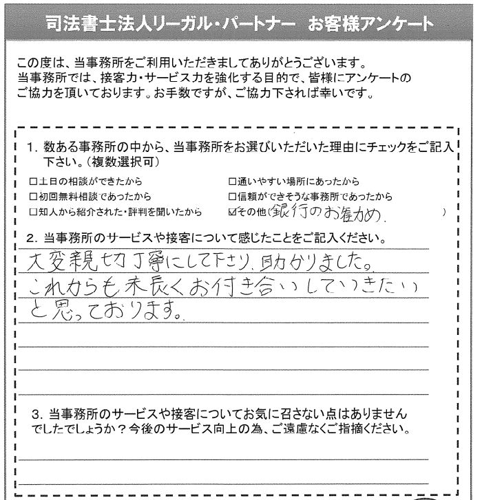 大変親切丁寧にして下さり、助かりました。これからも末長くお付き合いしていきたいと思っております。