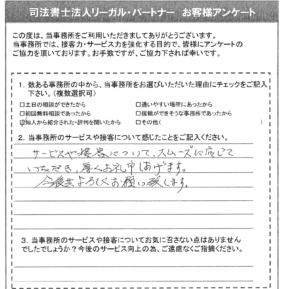 サービスや接客について、スムーズに応じていただき厚くお礼申し上げます。