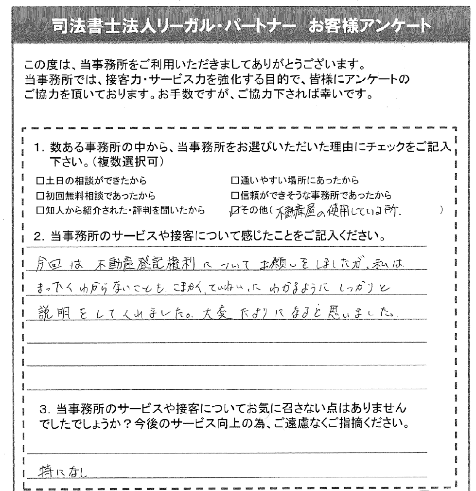 今回は不動産登記権利についてお願いをしましたが、私はまったくわからないこともこまかく、ていねい、にわかるようにしっかりと説明をしてくれました。
