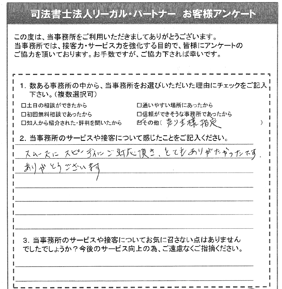 スムーズにスピーディーにご対応頂き、とてもありがたかったです。ありがとうございます。