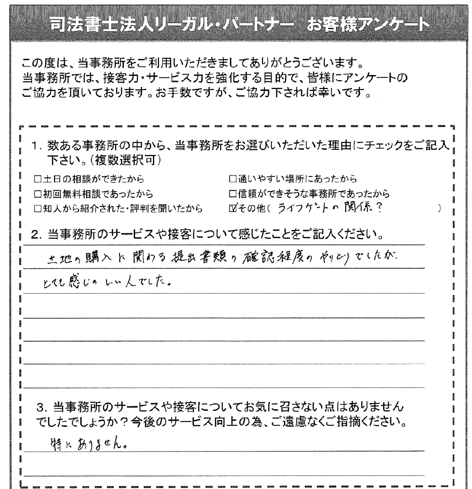 土地の購入に関わる提出書類の確認程度のやりとりでしたが、とても感じのいい人でした。