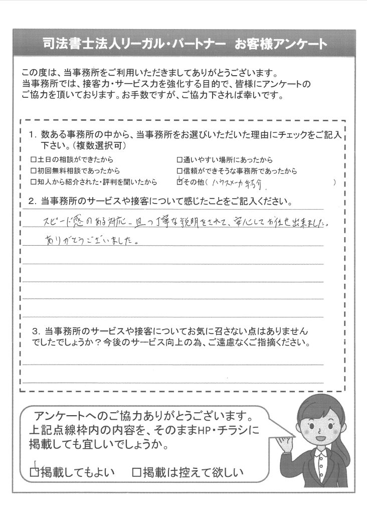スピード感のある対応、且つ丁寧な説明をされて、安心してお任せ出来ました。