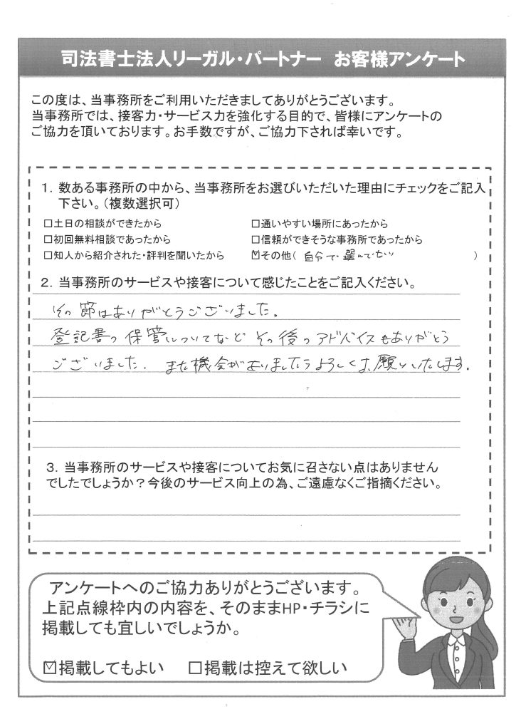 登記書の保管についてなど、その後のアドバイスもありがとうございました。
