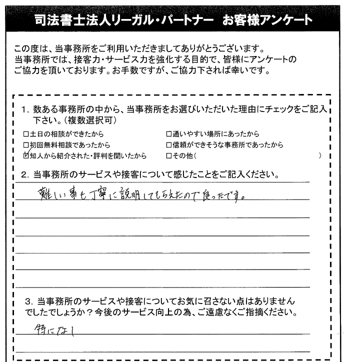 3.当事務所のサービスや接客についてお気に召さない点はありませんでしたでしょうか?今後のサービス向上の為、ご遠慮なくご指摘ください。