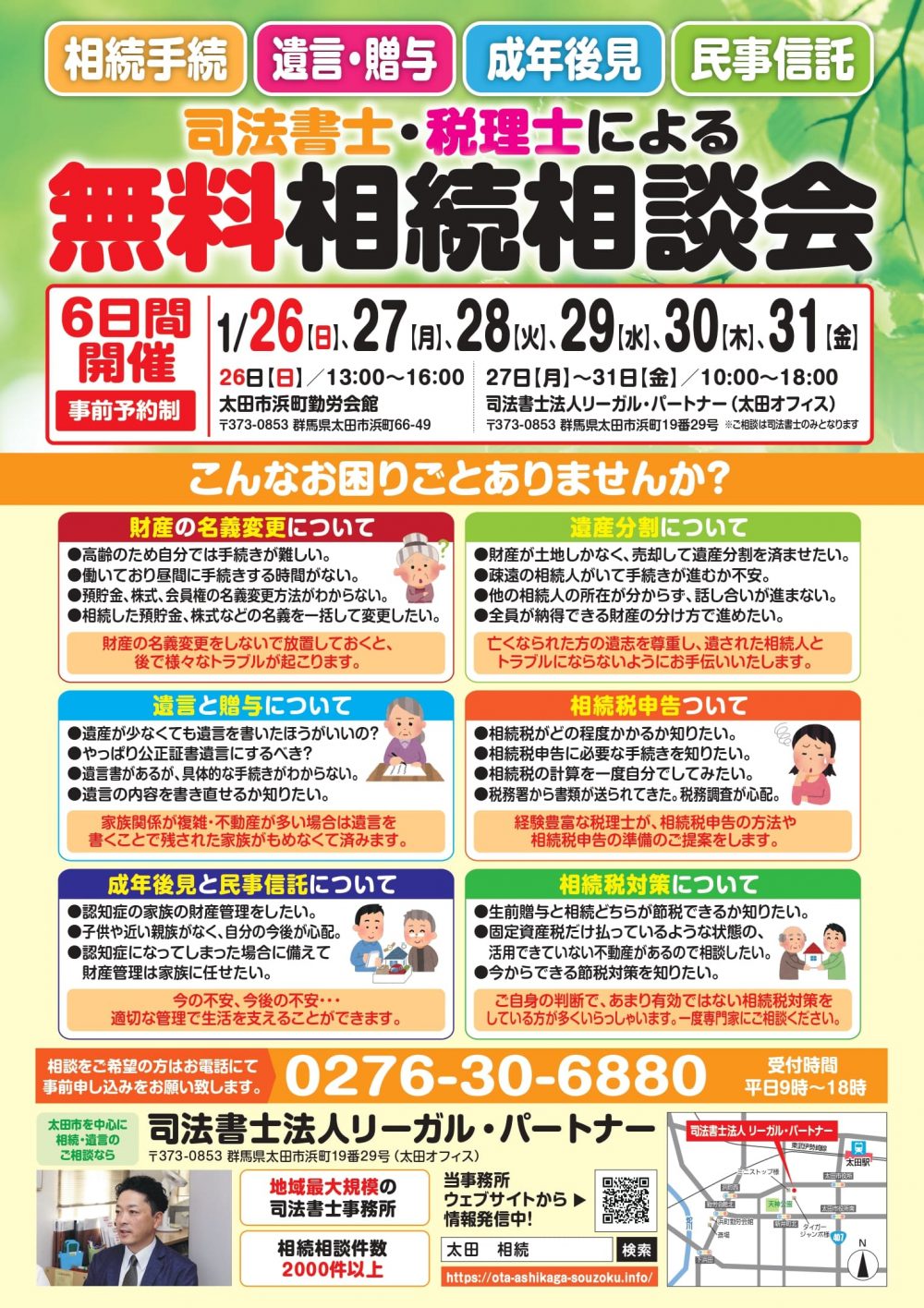 1月27日(月)~31日(金)10:00~18:00(司法書士法人リーガル・パートナー 太田オフィス)