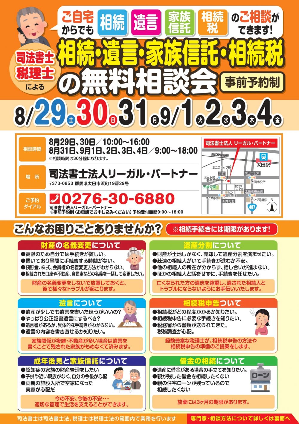 2020年8月29日(土)~9月4日(金)「相続・遺言・家族信託・相続税の無料相談会」を開催いたします!