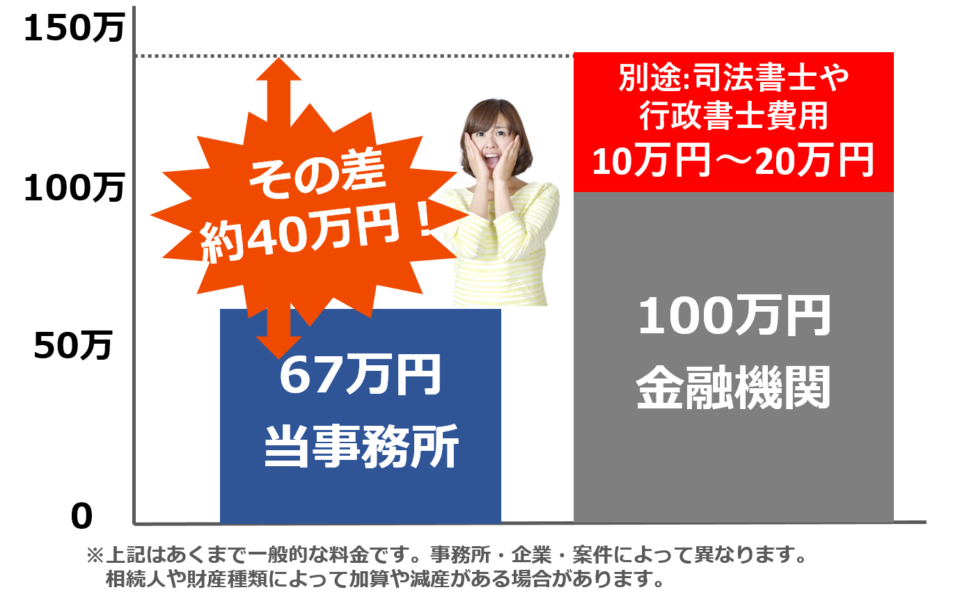 信託銀行に依頼した場合、遺産分割協議書の作成や不動産の名義変更手続については司法書士報酬として別途費用がかかりますが、当事務所はこれらの手続きも下記料金に含みます。
