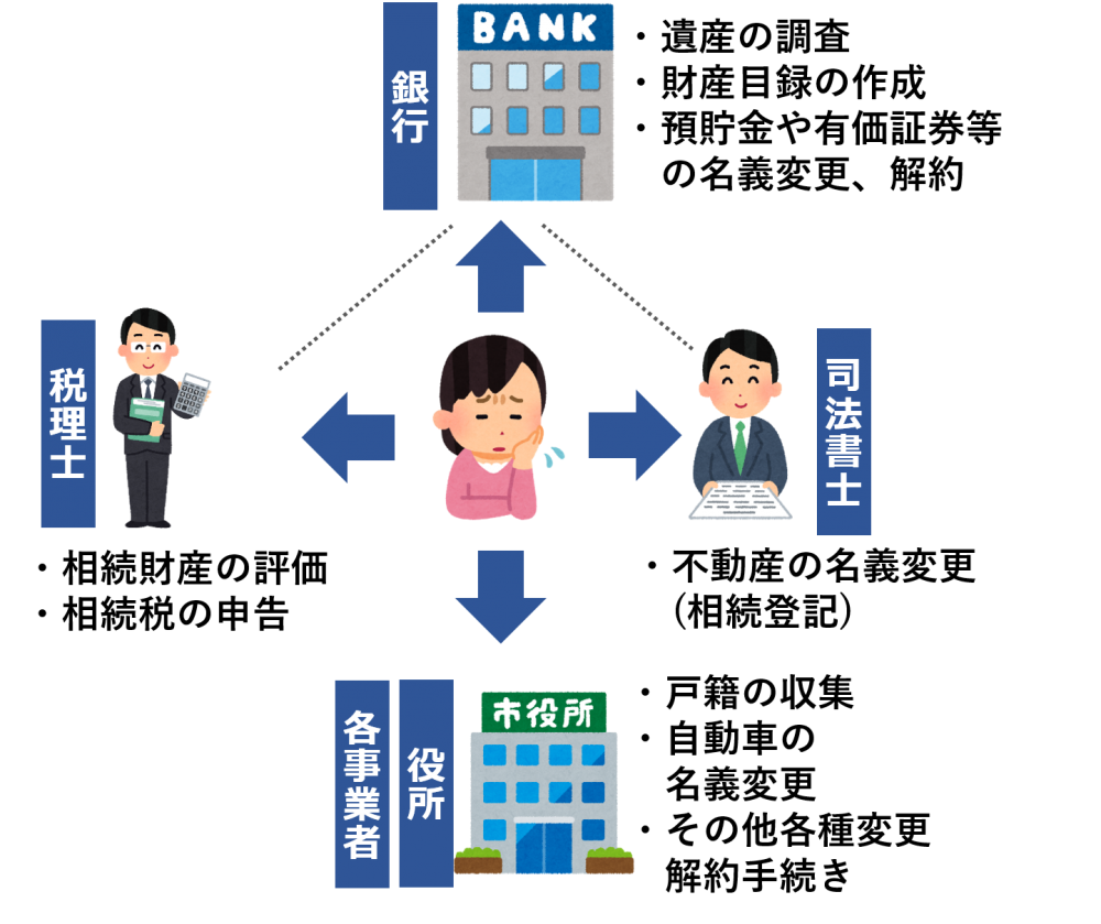 つまり、相続に関わる法的続きを各士業への適切に振り分けること(司法書士、税理士、行政書士、土地家屋調査士、不動産鑑定士などへ)と、各金融機関の預貯金の名義変更業務が主な業務です。
