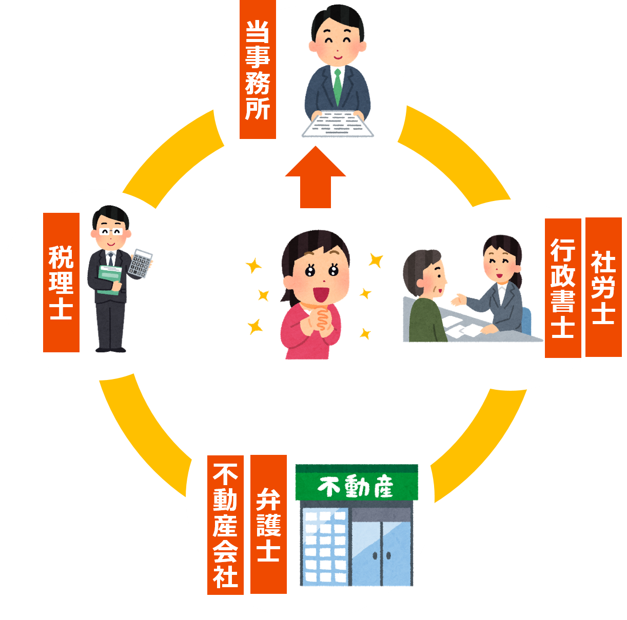 相続税が発生する案件であれば、相続税に詳しい税理士を紹介させていただき、争いが生じてしまった場合には、遺産分割に精通している弁護士など連携を組んでいる相続に詳しい士業事務所の紹介が可能です。